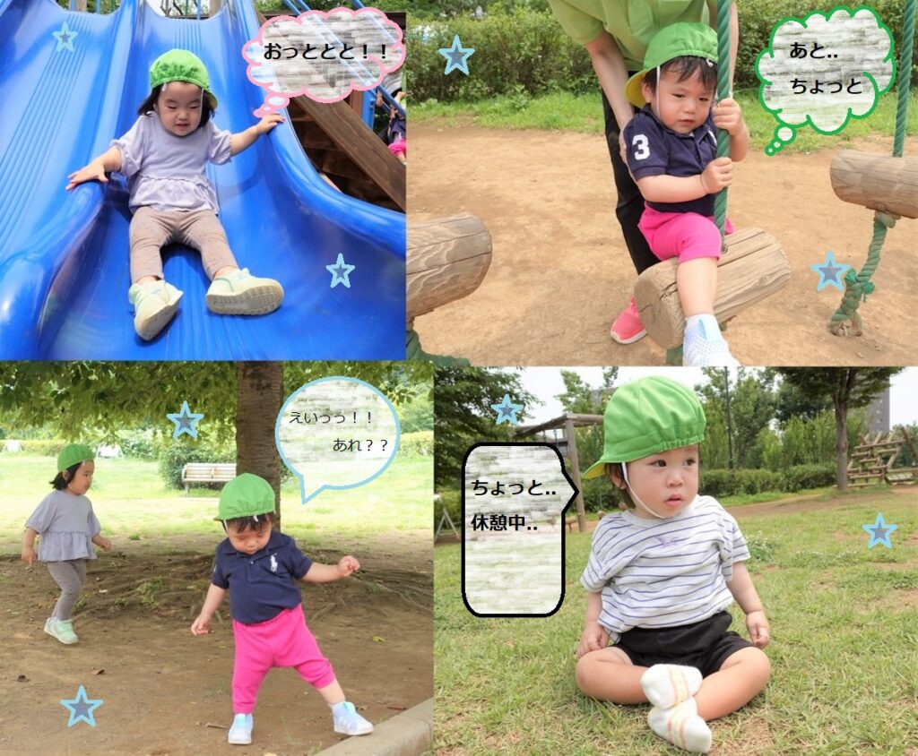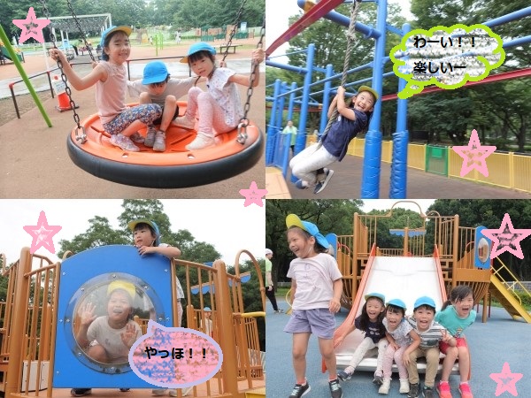 公園に到着すると、大きな滑り台を先生と一緒に滑ったり、高さが違うアスレチックなど沢山の遊具で遊んだりしました。