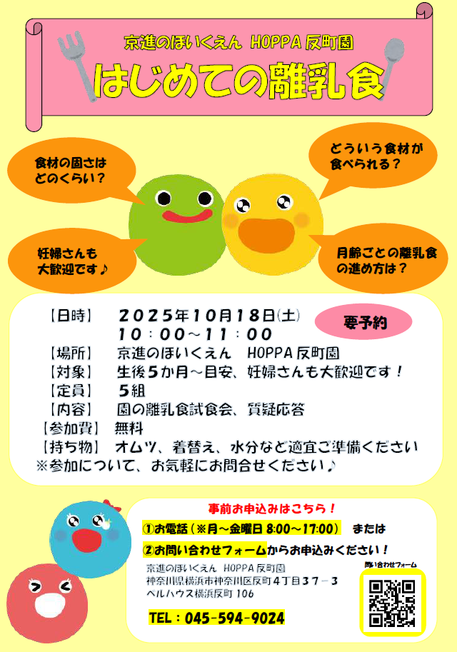 【神奈川県横浜市】園開放イベント開催のお知らせ~離乳食相談会~【HOPPA反町園】