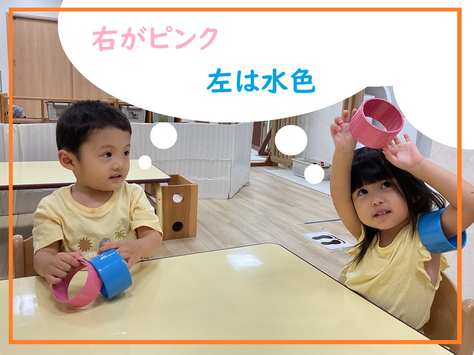 「右はどっち?」と聞かれると右手に持っている輪っかを上げて答えていますよ。