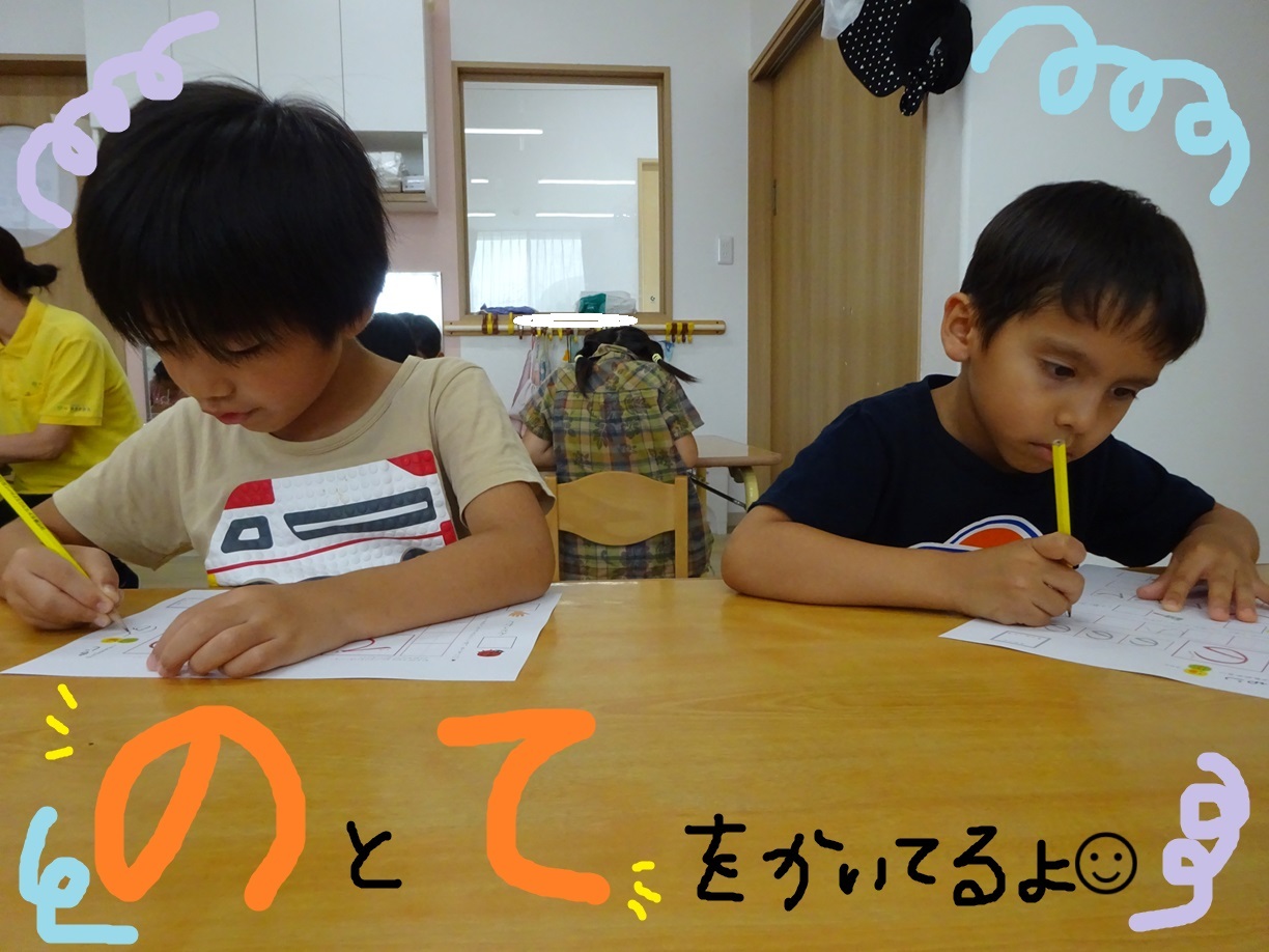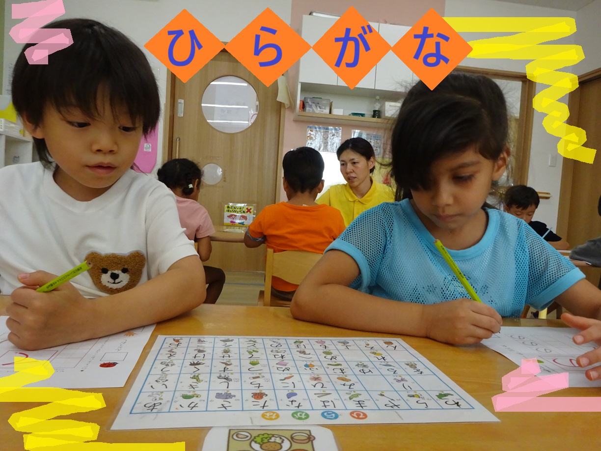 知育の時間にみんなでしりとりを楽しんだり、ひらがなプリントに取り組んだりしています。