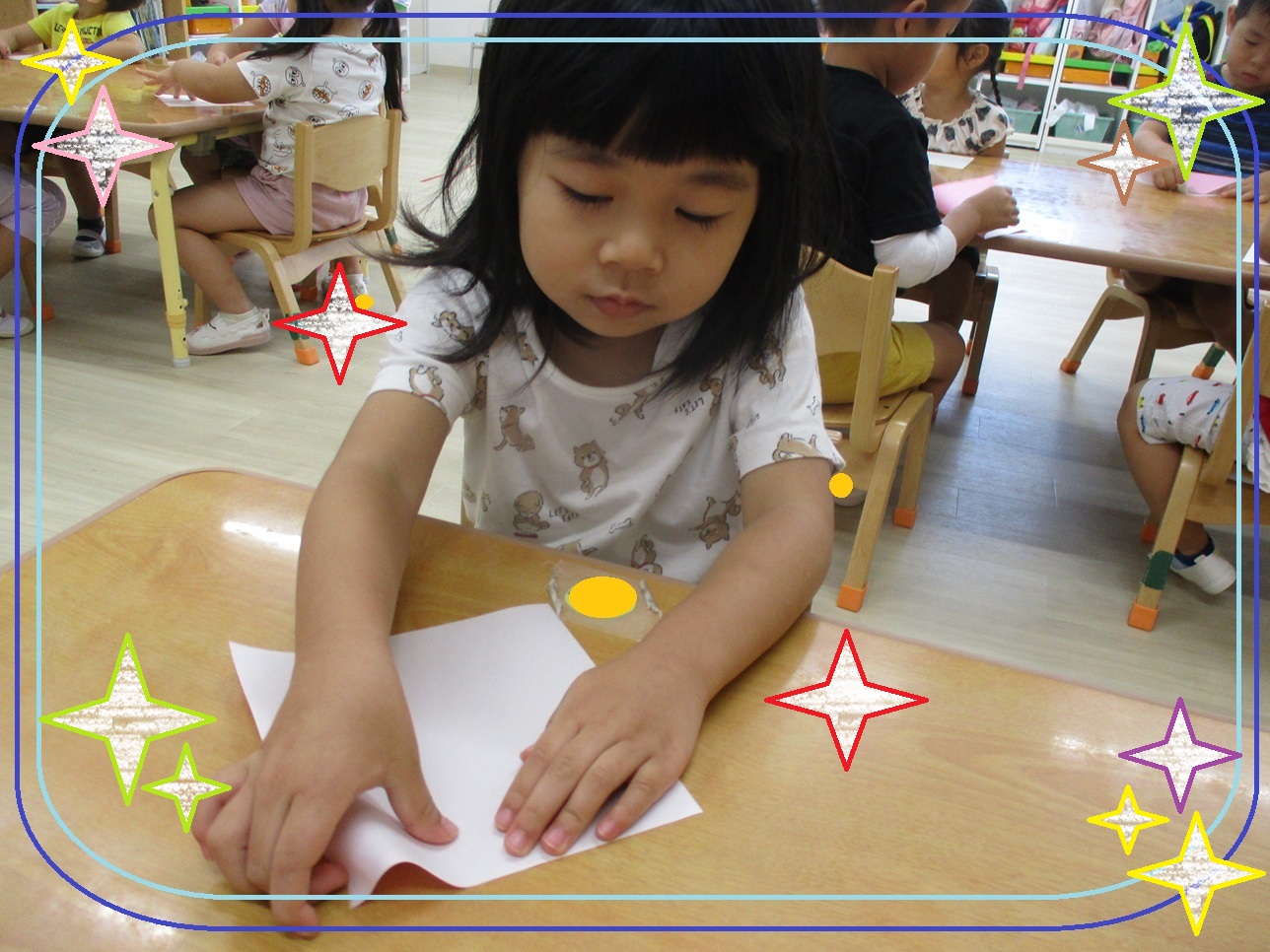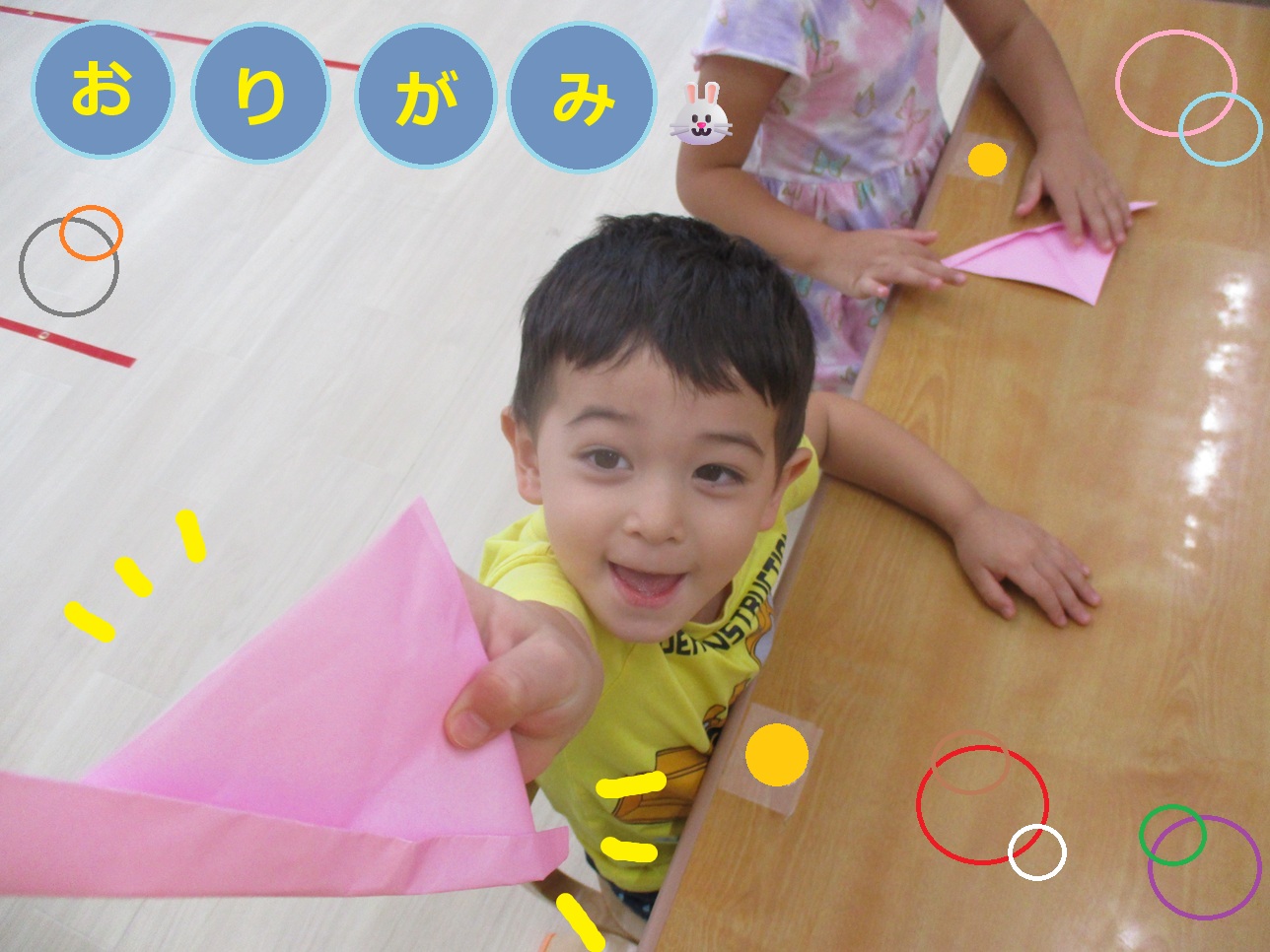 日頃からお兄さんお姉さんたちがしている折り紙を自分たちもできるようになったことが嬉しいようで「みてー!!」と折れたものを見せてくださいます!