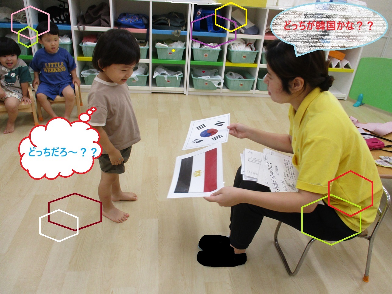 カペラ組では知育timeに国旗・ことわざ・ひらがななど様々な事に取り組み、子どもたちが飽きずに楽しんで参加できるようにしています。
