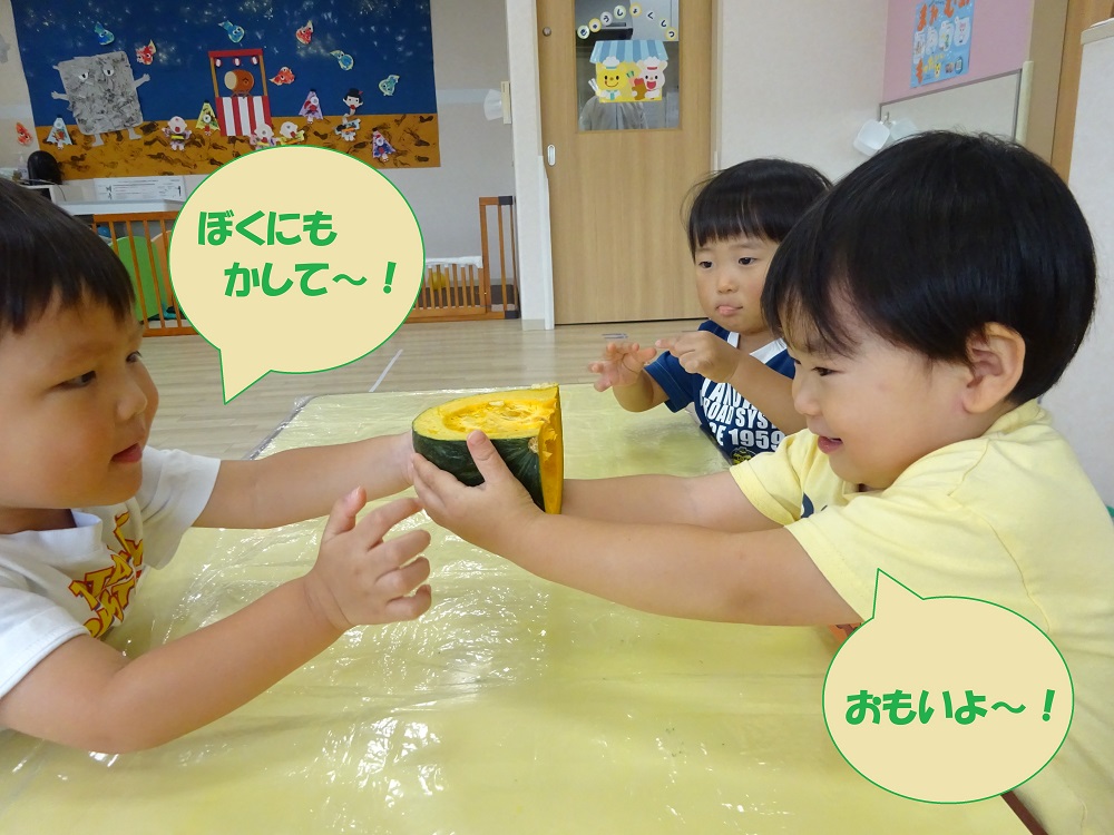 その子どもたちの興味から、食育活動としてかぼちゃに実際に触れてみました。