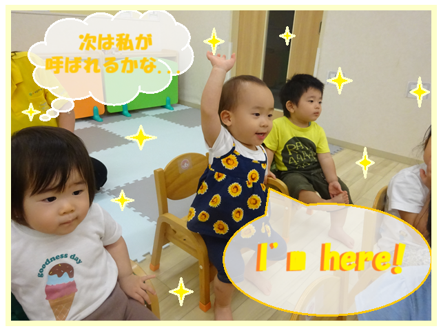 スピカ組(0歳児)とベガ組(1歳児)はお名前を呼ばれると「I’m here!」と手を挙げてお返事をします。