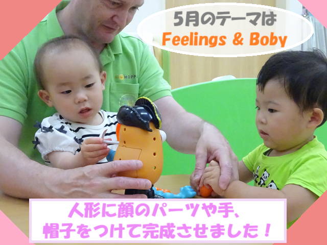 人形に目や鼻、口の顔のパーツや、手や帽子を付けて完成させました!