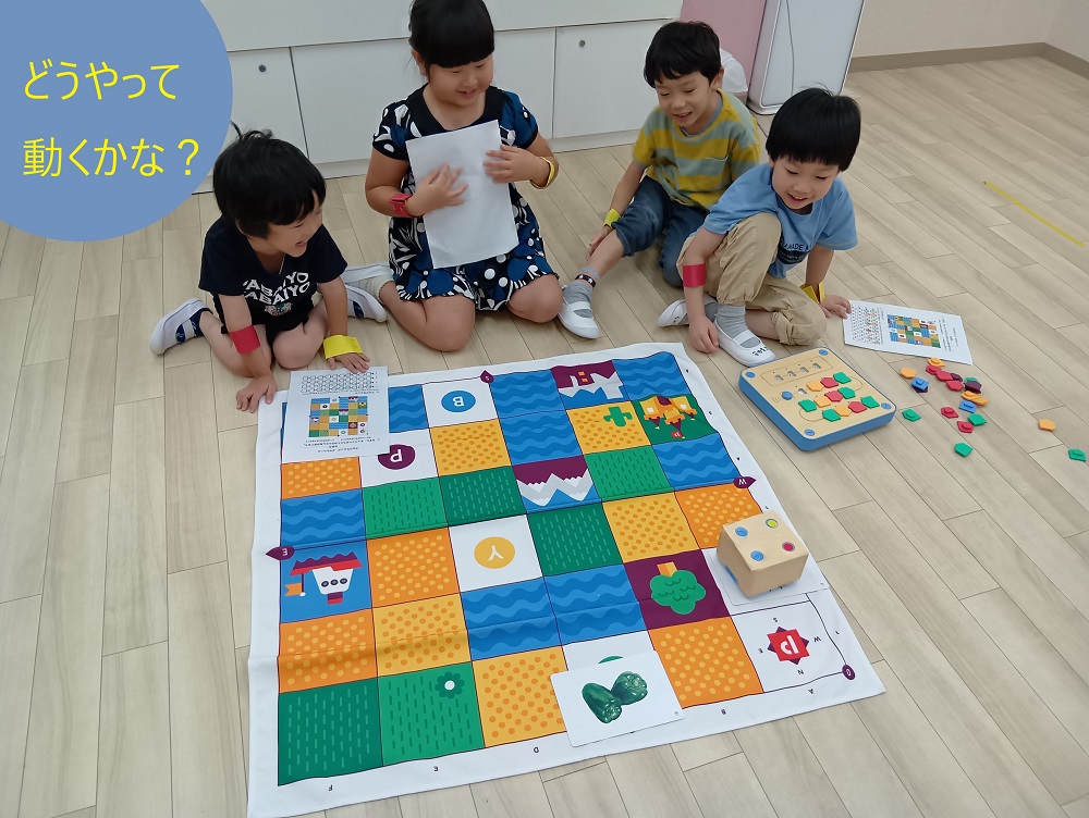 シリウス組ではキュベット🤖を使って左右の理解を深め、目的場所までの道順や必要な物を選びながら、自分の力でプログラムを組み目的場所へたどり着くことを目指しています。