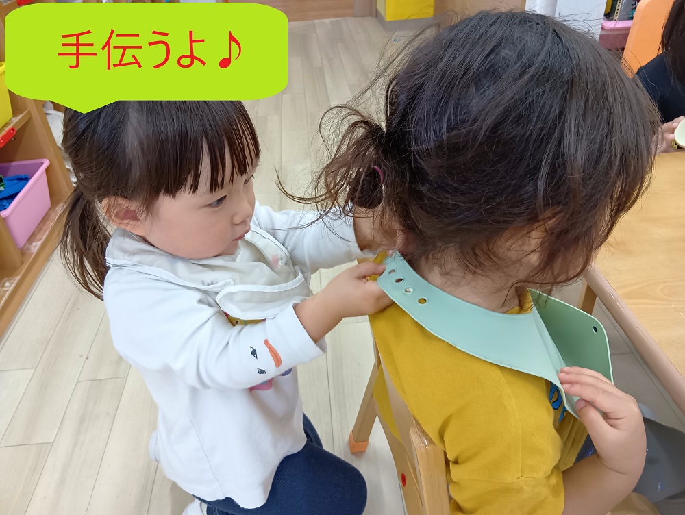 「自分で」の気持ちが強くなる時期のリゲル組では、食事の時に自分でエプロンを首にかけてつけることを頑張っています。