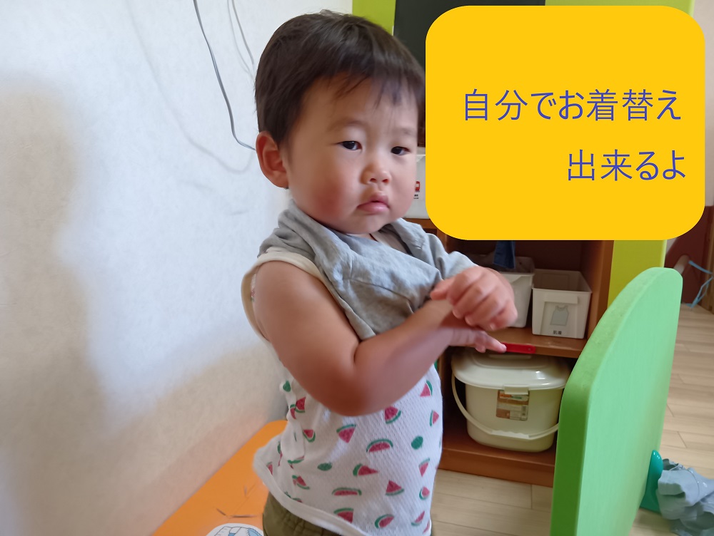 スピカ組では着脱の時に見通しが持てる声がけを行いながら自分で着替えができるように服の前後を伝えることで、順序立てて考える力を養っています😊