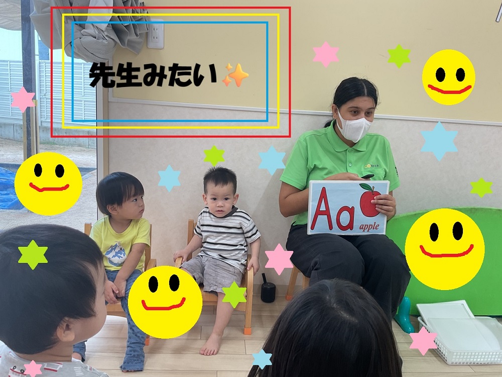 English teacherのようにみんなの前に座りお手本となって歌を歌ったり、Englishで色を答えられるようになってきました!
