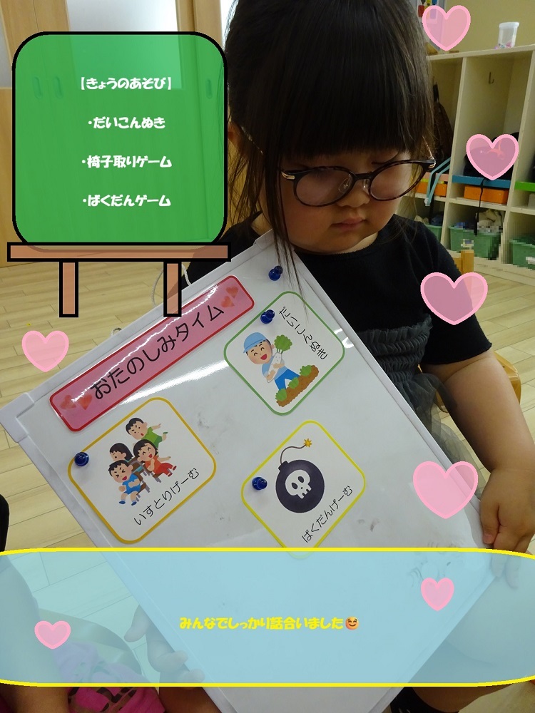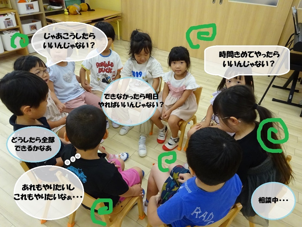 いくつかの遊びの中からどのような順番で、どの遊びを今日はやるのかを子どもたち同士で話をして決めてもらっています。
