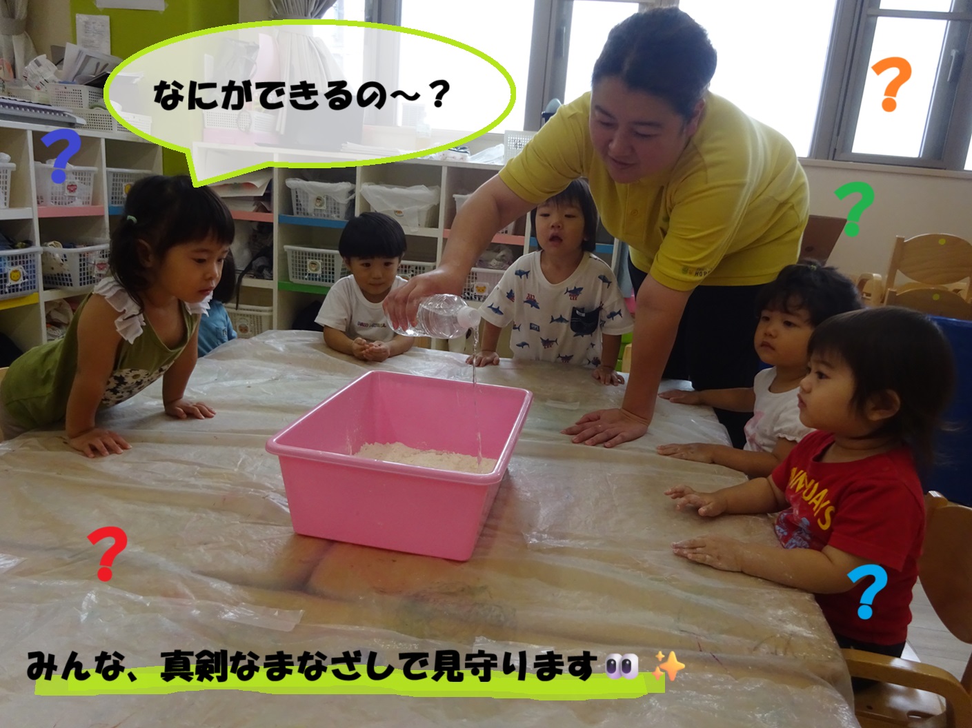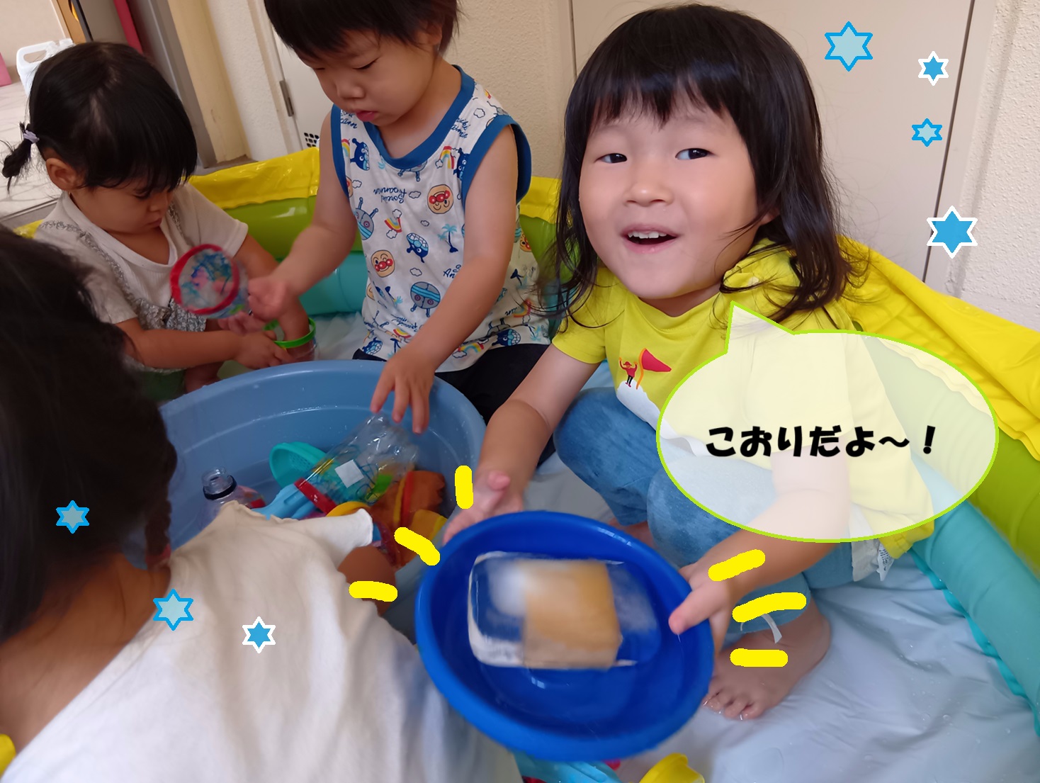 さらには水に氷を浮かべて、水の冷たさを味わったり、溶けていくのを観察したり…と氷遊びも取り入れました❄