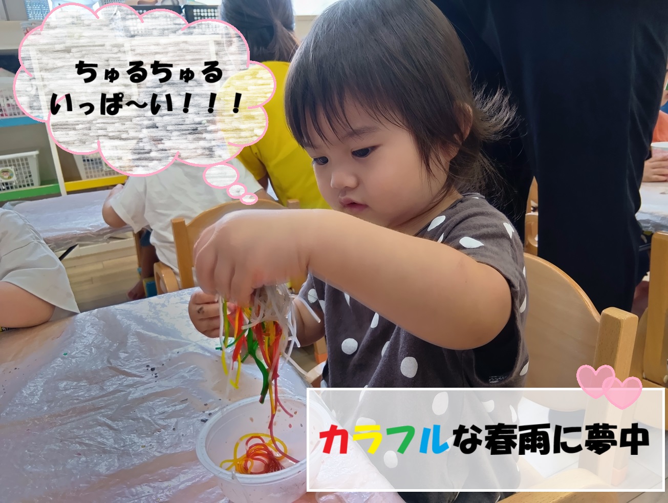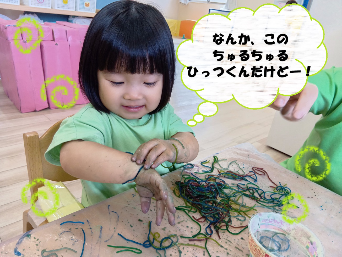 みんなが大好きうどんに似ている細長い麺に興味津々、カップから出したり入れたり、手につけたり、もみもみしたり、大喜びでした💛