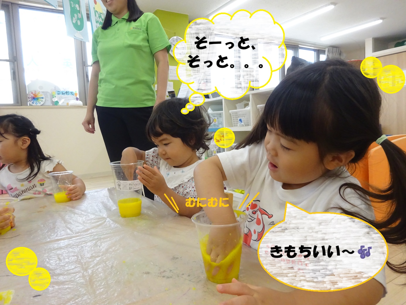 次、つぶしたゼリーの中に手を入れて、ひんやりとした感触を楽しみました✊