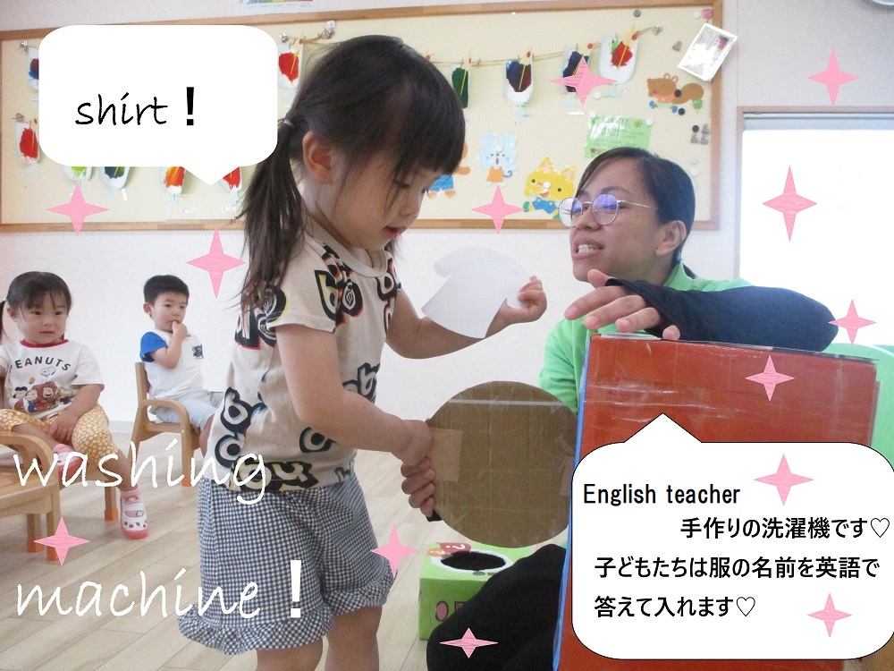 簡単な英単語は、English teacherの言葉を繰り返して声に出すことで、遊びの中から自然と身についていきます。