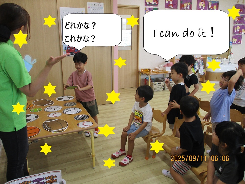 English timeでは「はーい」と積極的に手を挙げ、お友だちと協力してゲームに参加し、成功するとハイタッチをして喜んでいます。