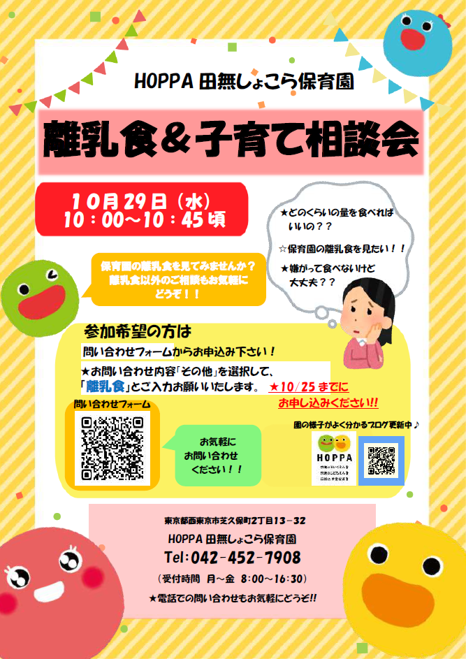 HOPPA田無しょこら保育園(東京都西東京市小規模認可保育園)の園体験イベント~離乳食&子育て相談会~のお知らせです😊