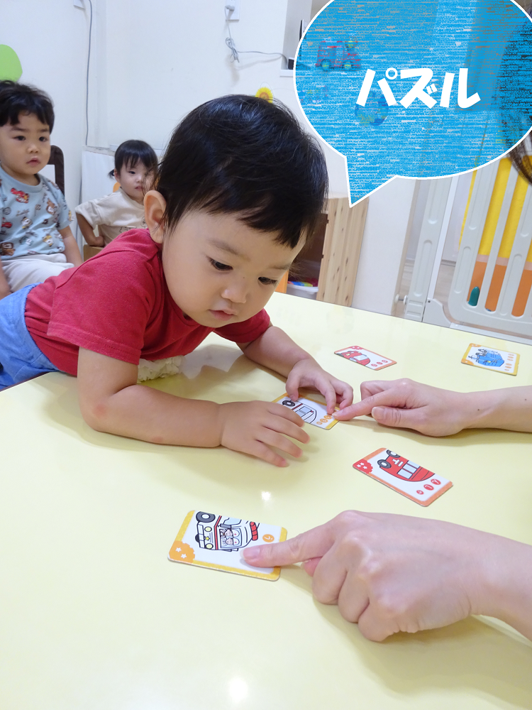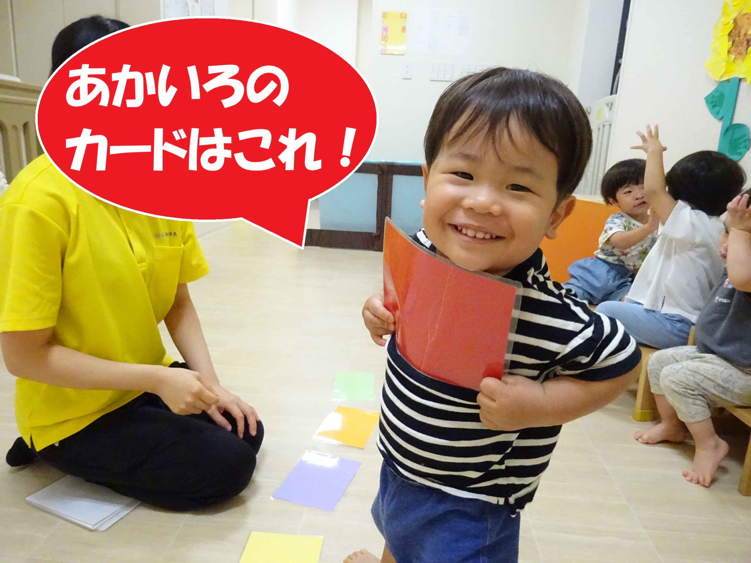 色のカードを使った知育では、「赤いカードを持ってきてください」と先生が声をかけると、みんな嬉しそうにカードを手に取って見せてくれました✨