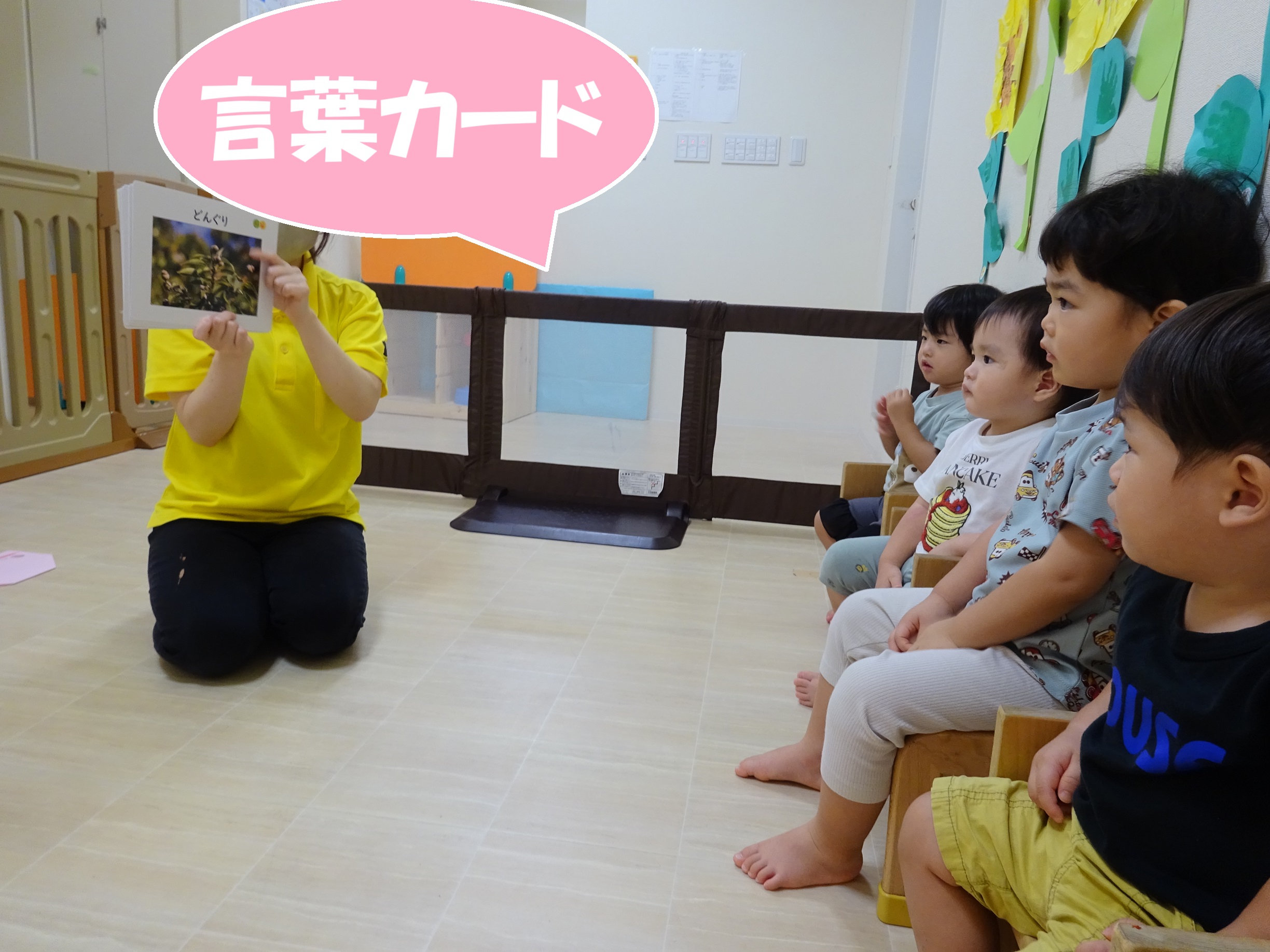また、「言葉カード」では、季節の写真を見ながら、「もみじ」「どんぐり」「かき」など、秋の言葉を声に出して楽しみました🍁