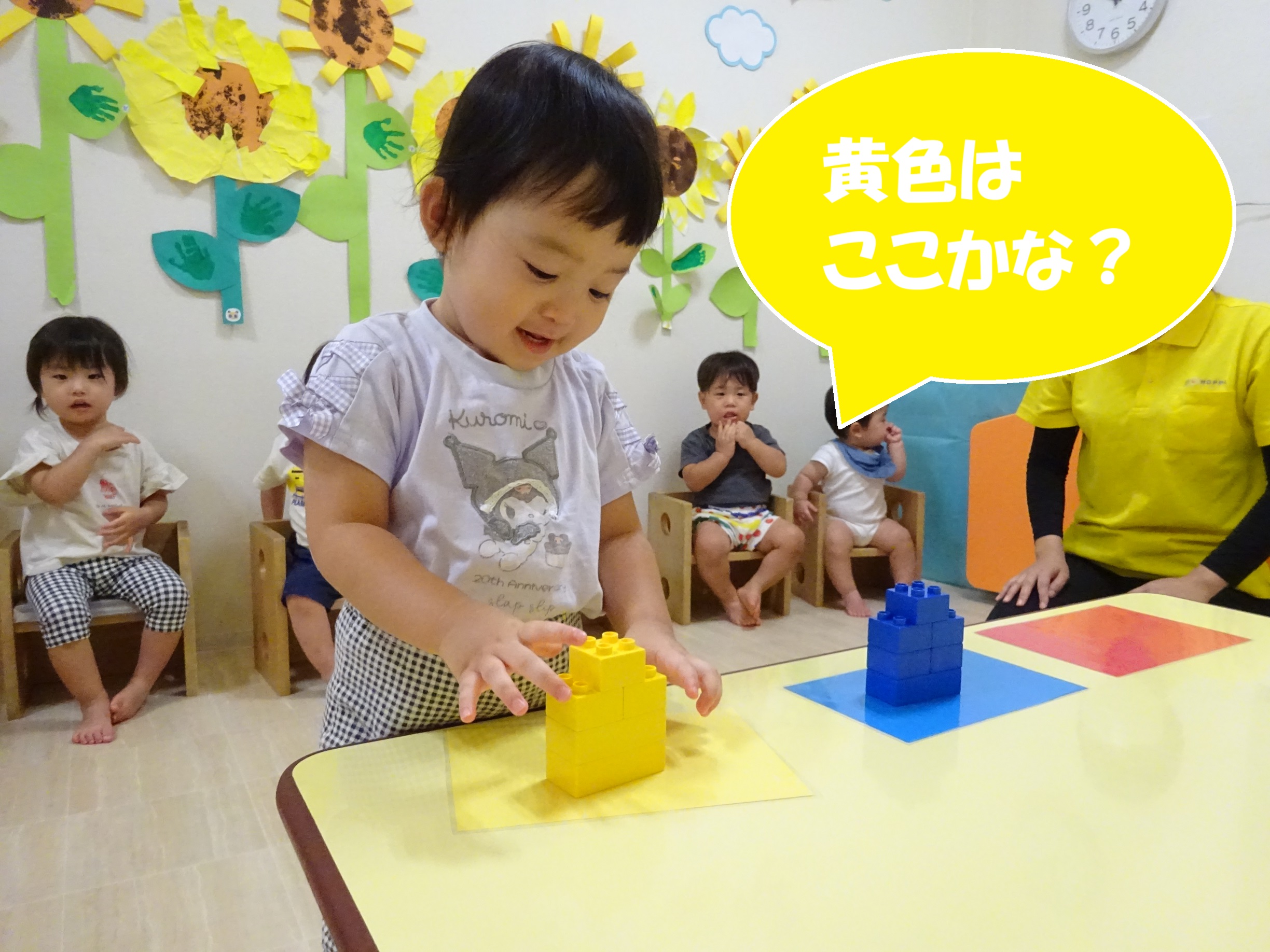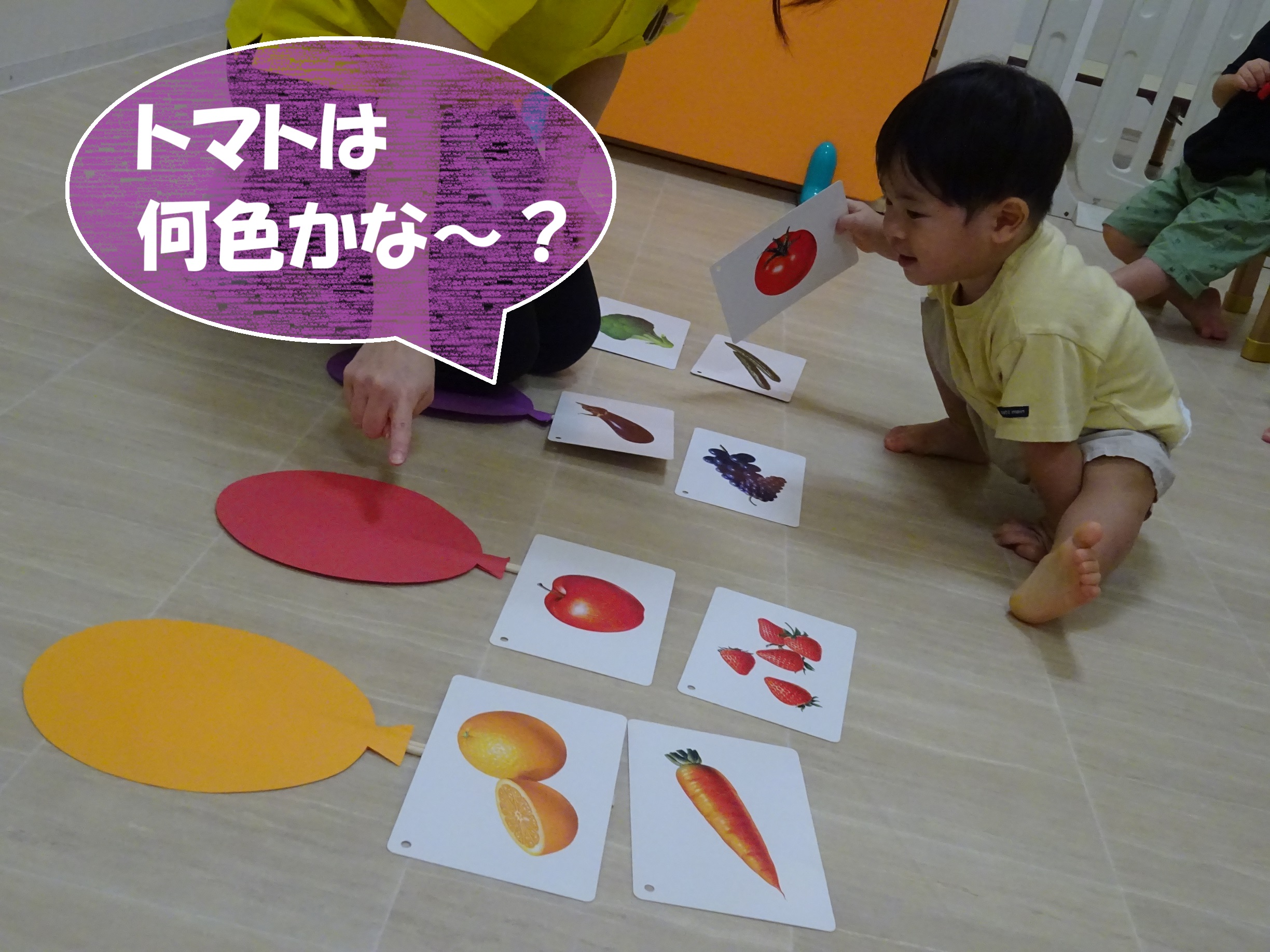 そこから発展して、同じ色のブロックをカードの上に置く遊びや、果物を色分けする活動も行いました!