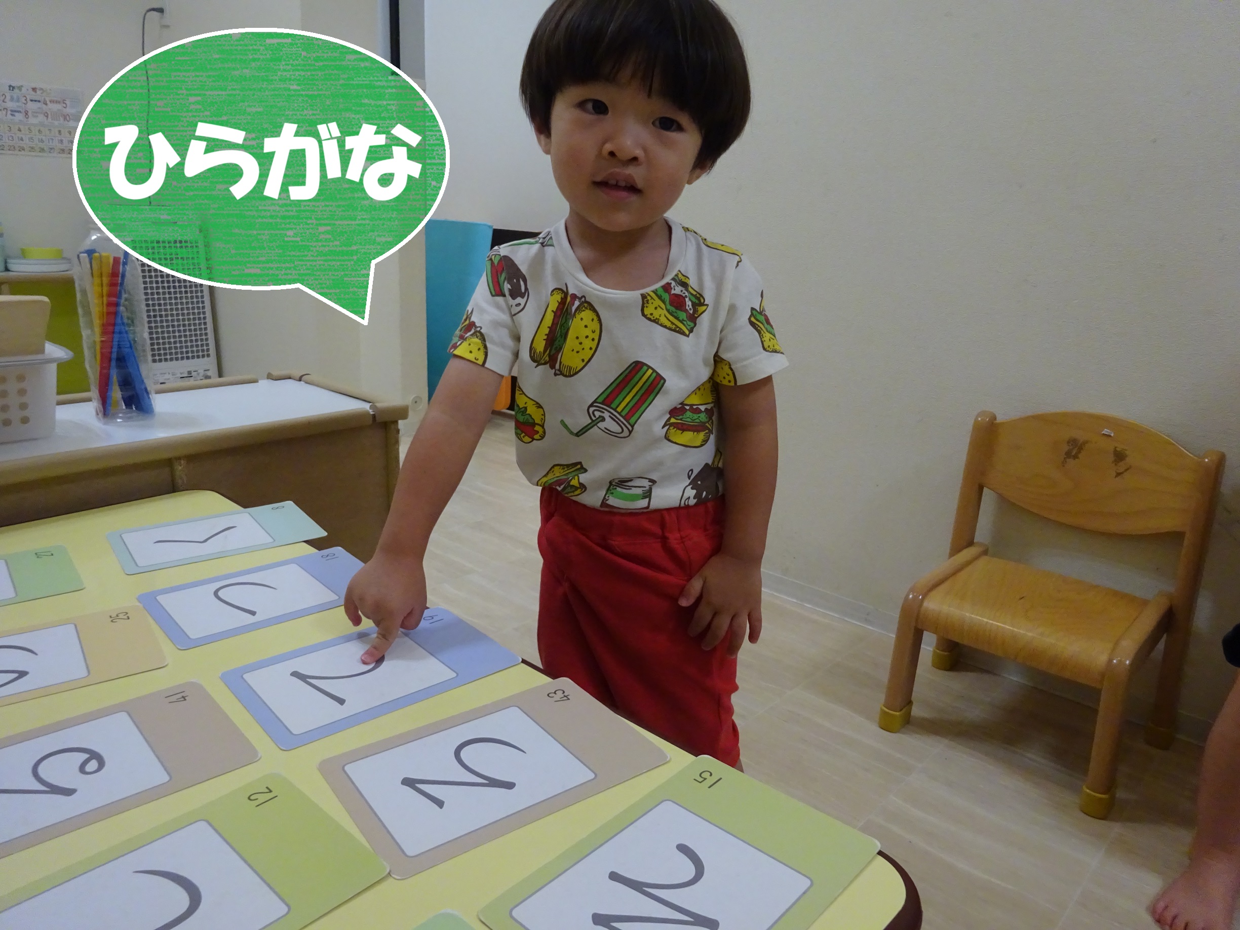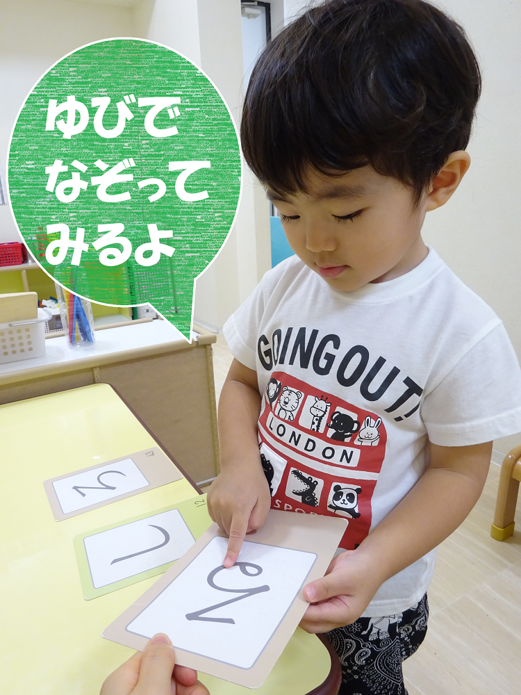 2歳児さんになると、ひらがなのカードを使って、同じ文字を探したり、指でなぞってみたり…