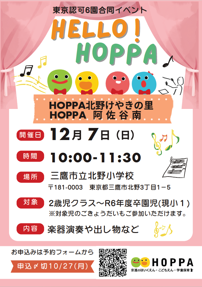 HOPPA北野けやきの里(東京都三鷹市認可保育園)とHOPPA阿佐谷南(東京都杉並区認可保育園)の合同イベントのお知らせです😊