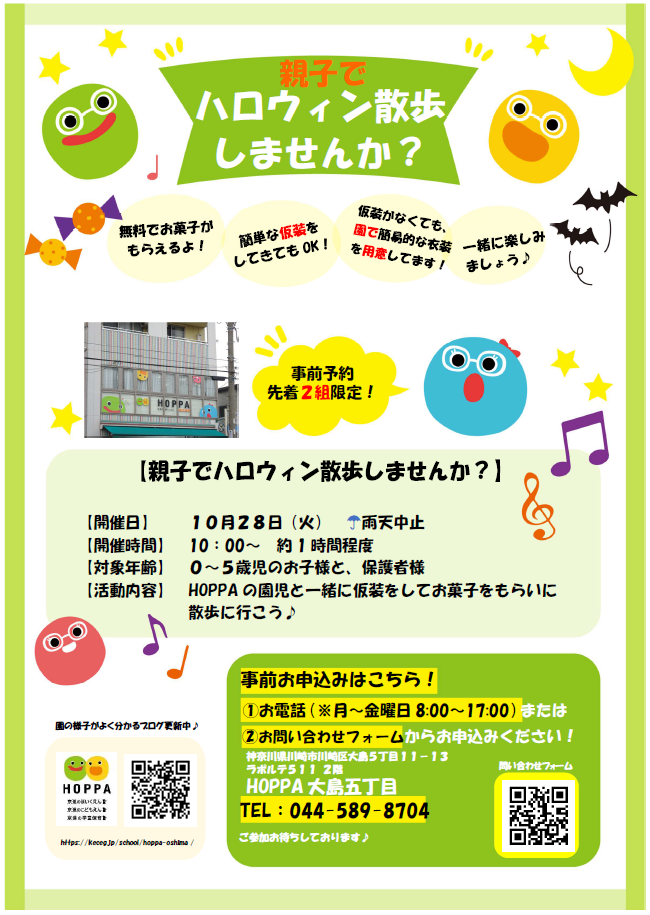 【神奈川県川崎市】園体験イベント開催のお知らせ~親子でハロウィン散歩~【HOPPA大島五丁目】