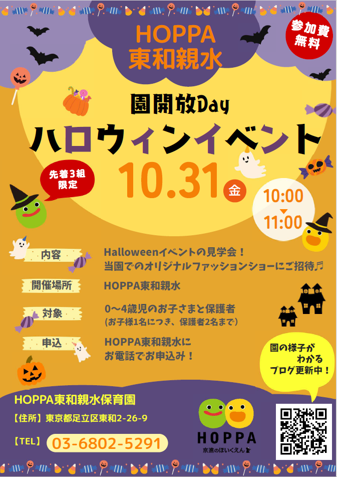 【東京都足立区】園体験イベント開催のお知らせ~ハロウィン🎃~【HOPPA東和親水】