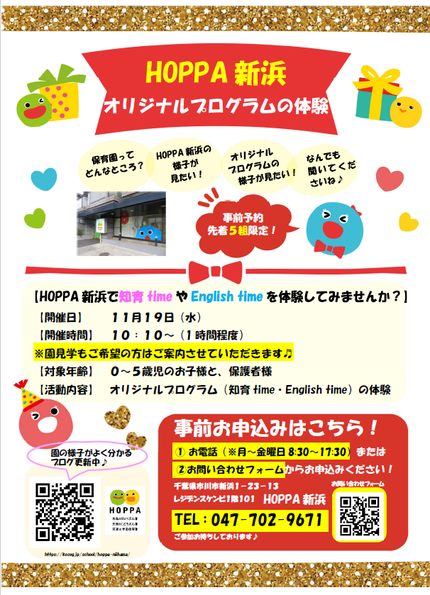HOPPA新浜(千葉県市川市認可保育園)の園体験イベントのお知らせです😊