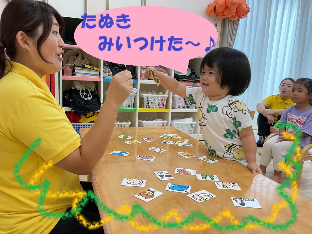 季節の変化をあまり感じられない沖縄ですが・・・沖縄らしさも取り入れながら「京進のほいくえんHOPPA」として!HOPPAオリジナルの「言葉カード」を活かして「秋」もきちんと伝えています。