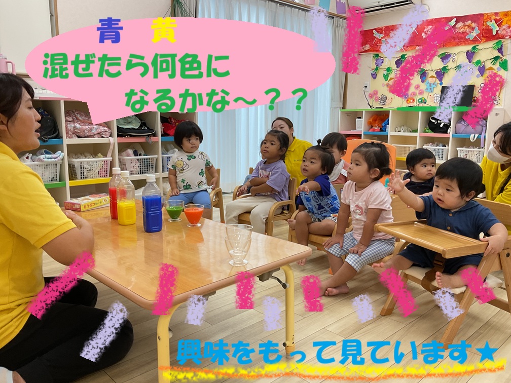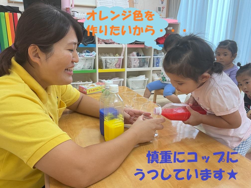 「赤色と黄色を混ぜたら・・・何色になるかな??」と実際に目の前で色水を混ぜるところを見せることで、子どもたちも興味を持ち、理解につながっています✨