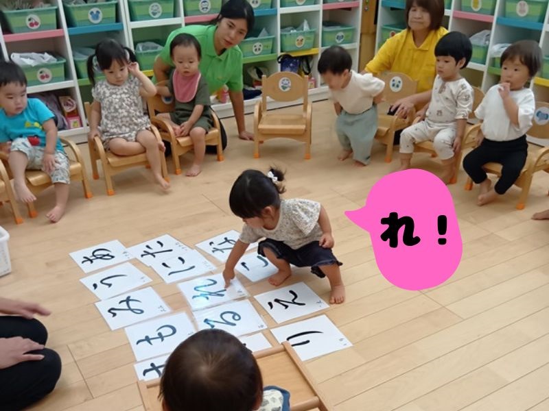 スピカ組(1歳児)では、自分たちの名前の頭文字を覚えています。