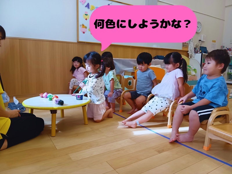 「いろいろいろって~♪」と歌いながらすることで、色の変化を知ったり、不思議そうにしたりと毎日新しい色の事もワクワクして楽しみにしています。