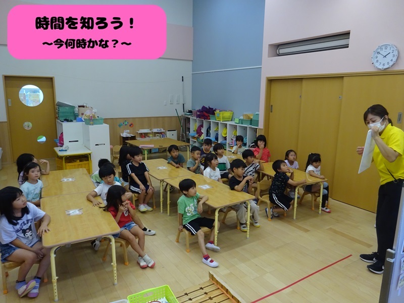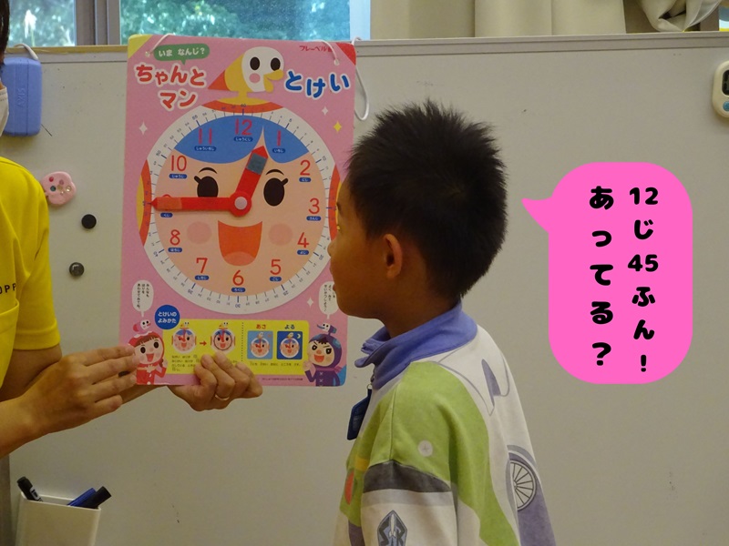 シリウス組(5歳児)では時計の読み方に親しめるように、普段の生活の中で『今は、〇時〇分です!』と知らせるようにしています。