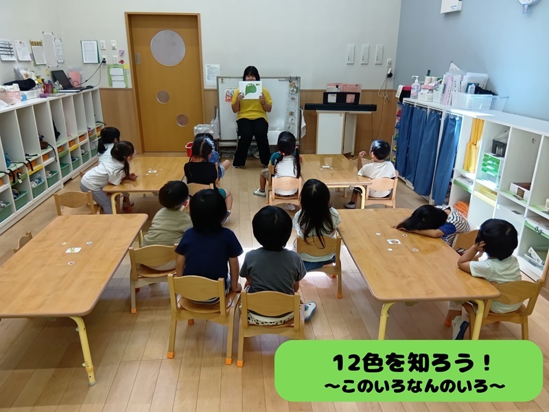 リゲル組(2歳児)では、生活の中にある『色』に親しめるように、12色の色カードを使って「赤色はお部屋の中にあるかな~?」と子どもたちに聞いています。
