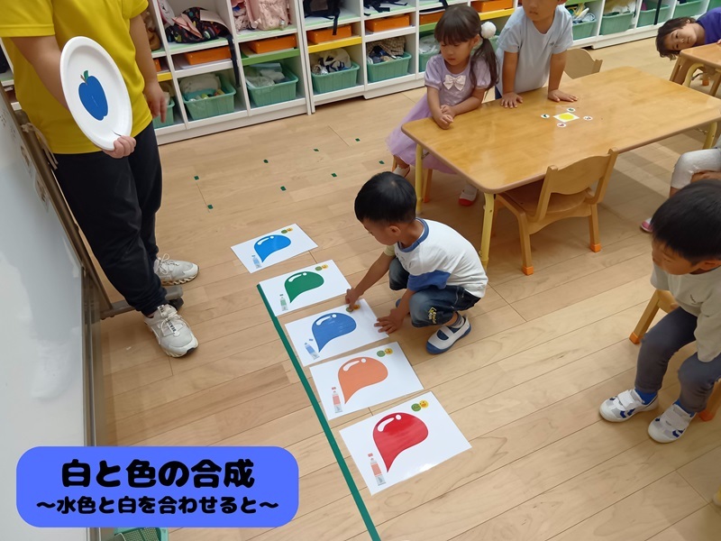 ミモザ組では、白色と色を混ぜるとどんな色になるかを楽しみながら知育timeをしています。
