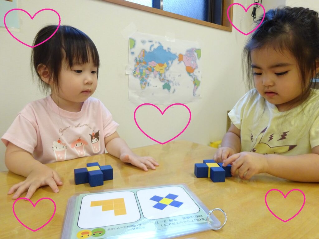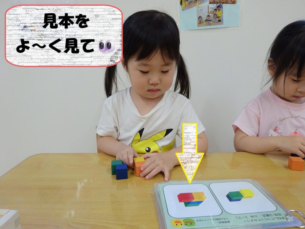 積み木を取り入れることで手先の器用さを促したり、空間認識能力を高めたり、見本をじっくり観察することで集中力を育んだり、様々な能力の発達を促しています👀