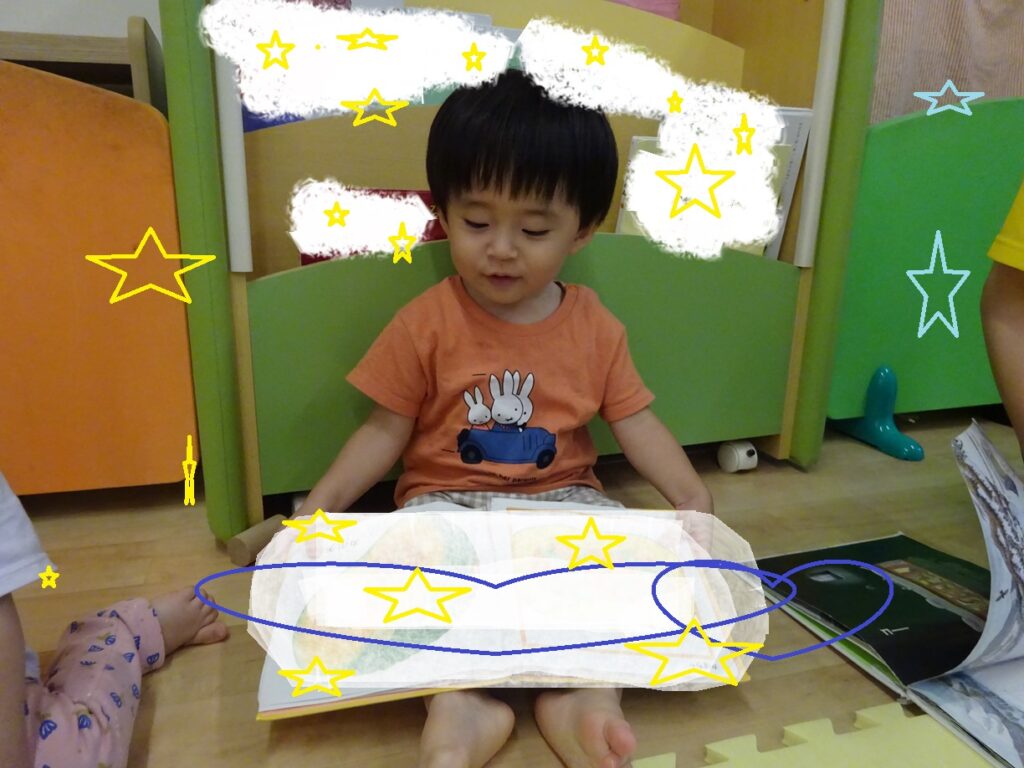 自分の名前が呼ばれると笑顔で返事(タッチ)をし、絵カードや本・遊びの教材に注視しながら興味津々な様子のスピカキッズ☺