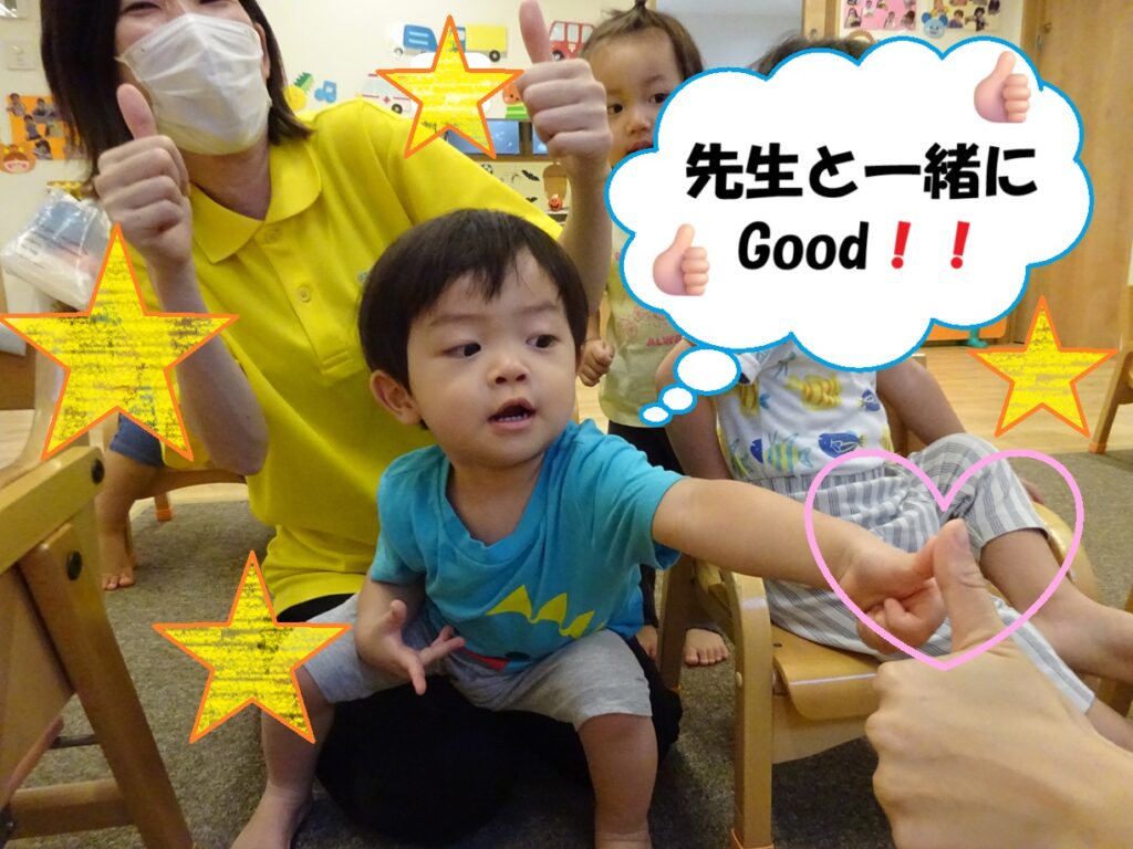 保育士の姿を見ながら、様々な動きや表情の真似っこを楽しんでいます🎶