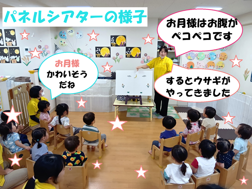 続いてのパネルシアターはお腹がすいて痩せてしまったお月様が、うさぎのついてくれたお団子を食べてどんどん太っていき満月になるというお話でした!