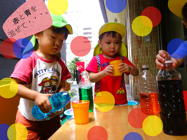 例えば、色水あそびでは「混ぜたら何色になるかな?」と想像し、実際に試して発見する。