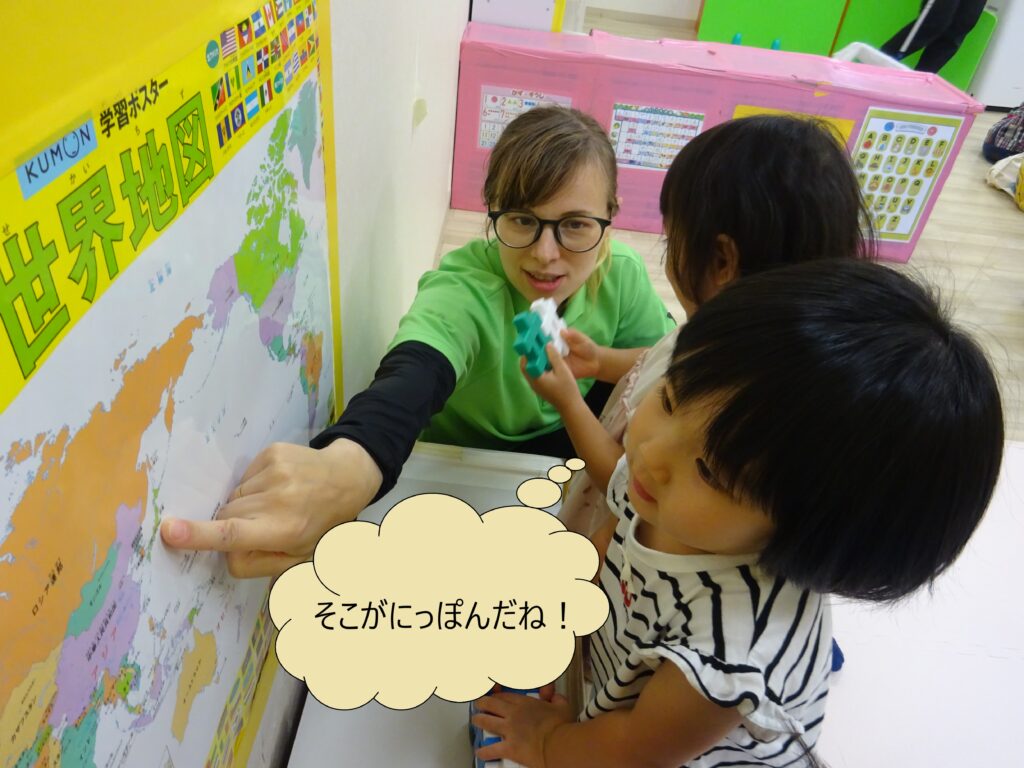 先日、English timeが実施されていた日に世界地図の前にやってきた子どもたちにEnglish teacherがみんなのいる日本の場所、自身の生まれ育った場所など指差ししながら、わかりやすく教えていましたよ。