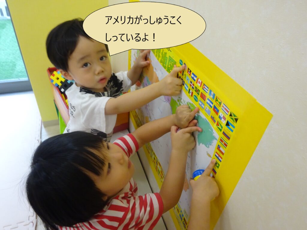世界地図や国旗は2歳児の部屋に掲示していますが、「ここしっている!」「ドイツあった」「アメリカがっしゅうこくだ!」などと正式名称で国名を話している姿が見られます!
