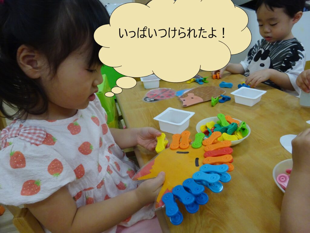 アイクリップを使用した遊びでは、動物さんのお顔のカードの周りにクリップをたくさんつけて遊んでいます。