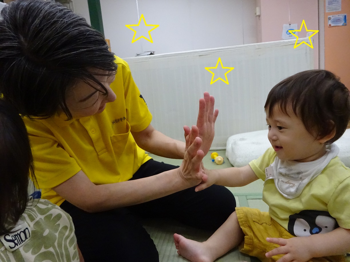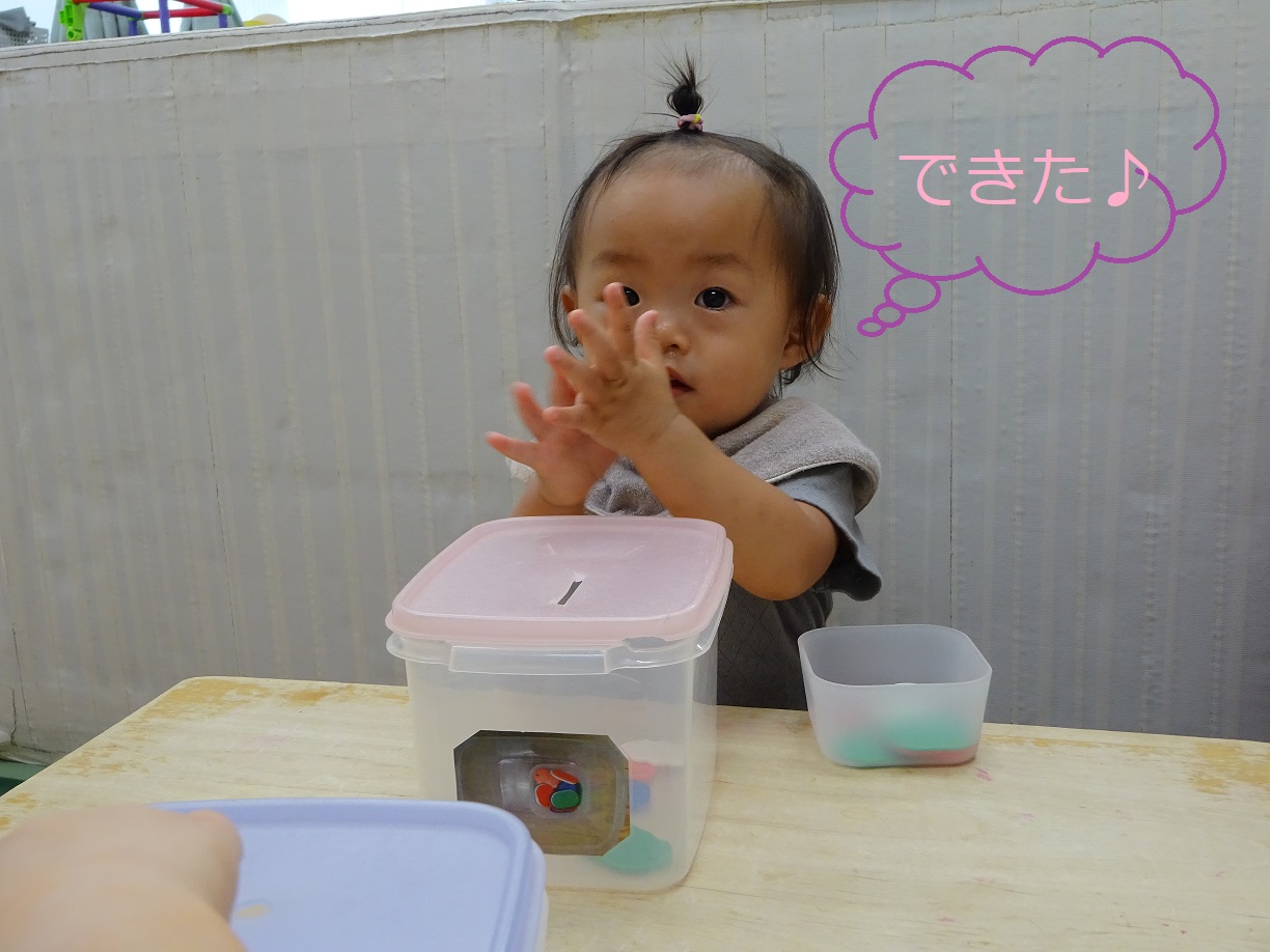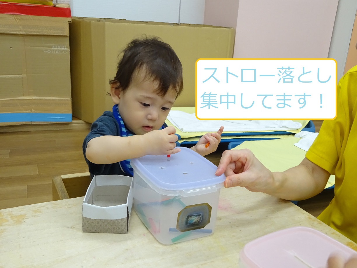 高月齢児は椅子に座って机上遊び(ポットン落とし・コイン落とし・シール貼り)指先を使った遊びができるようになり、初めは5分集中する様子でしたが、繰り返し行うことにより「もっとやりたい!」と気持ちが芽生えています!