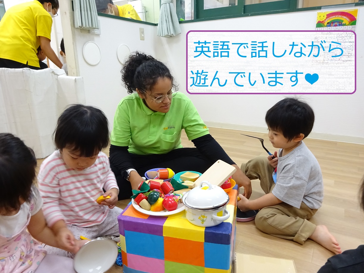 遊びの中でもおままごとをしていると子ども同士で「ヤミー!」と英語でお話しする声が聞こえてきます😊