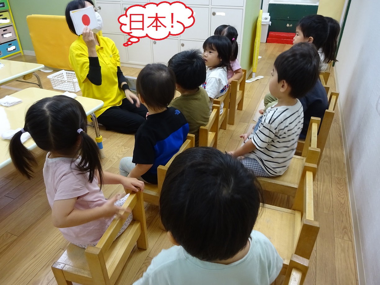 日本のカードが出ると「みんながいるところは日本!」と応えている姿や、フランスやブラジルの国旗を見ると「○○先生(English teacher)のお家だよ」と楽しみながら国旗を覚えています。