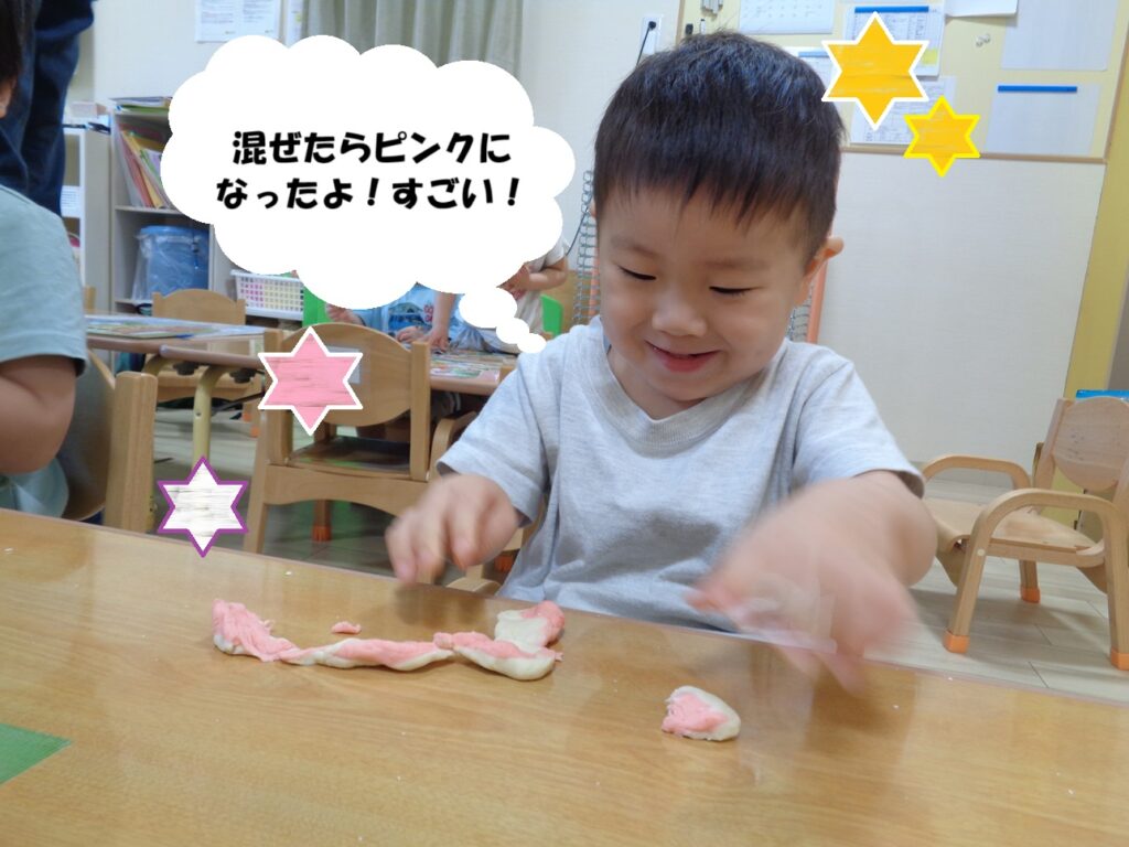 粘土遊びでは、赤と白の粘土を混ぜると「ピンクになったー!」と嬉しそうに教えてくださる中で、「なんでだろう?」と疑問に思われる姿も見られています!