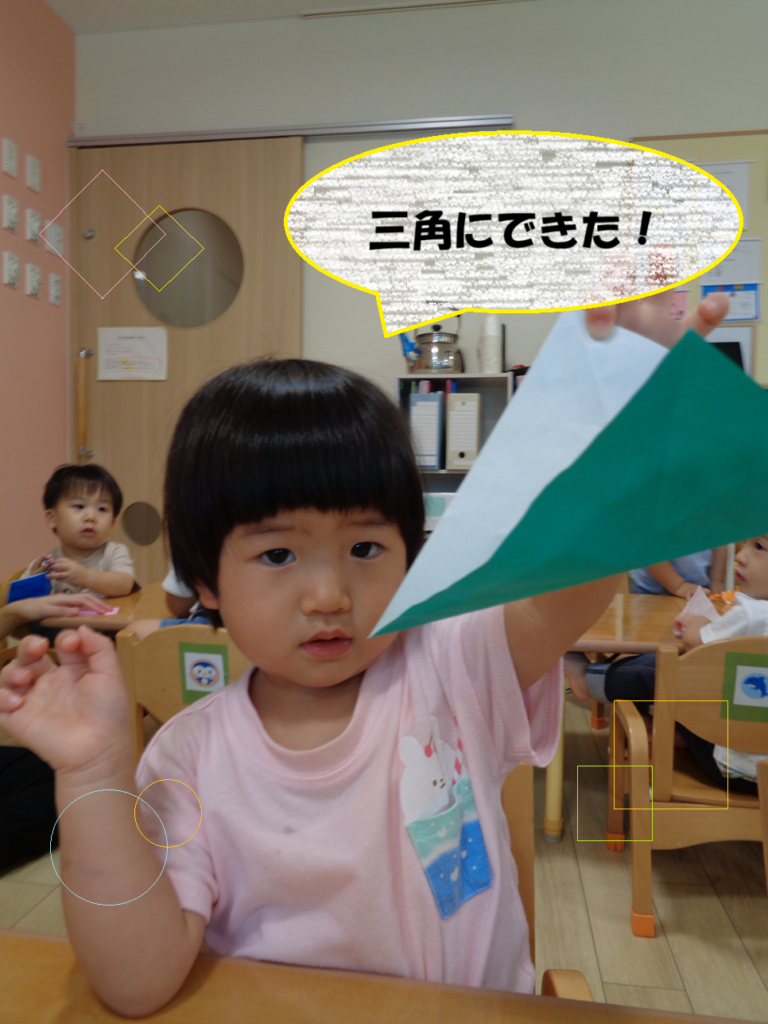 「三角に折ってみよう!」と伝えると難しいながらにも挑戦して「できたー!」と笑顔が見られます💗