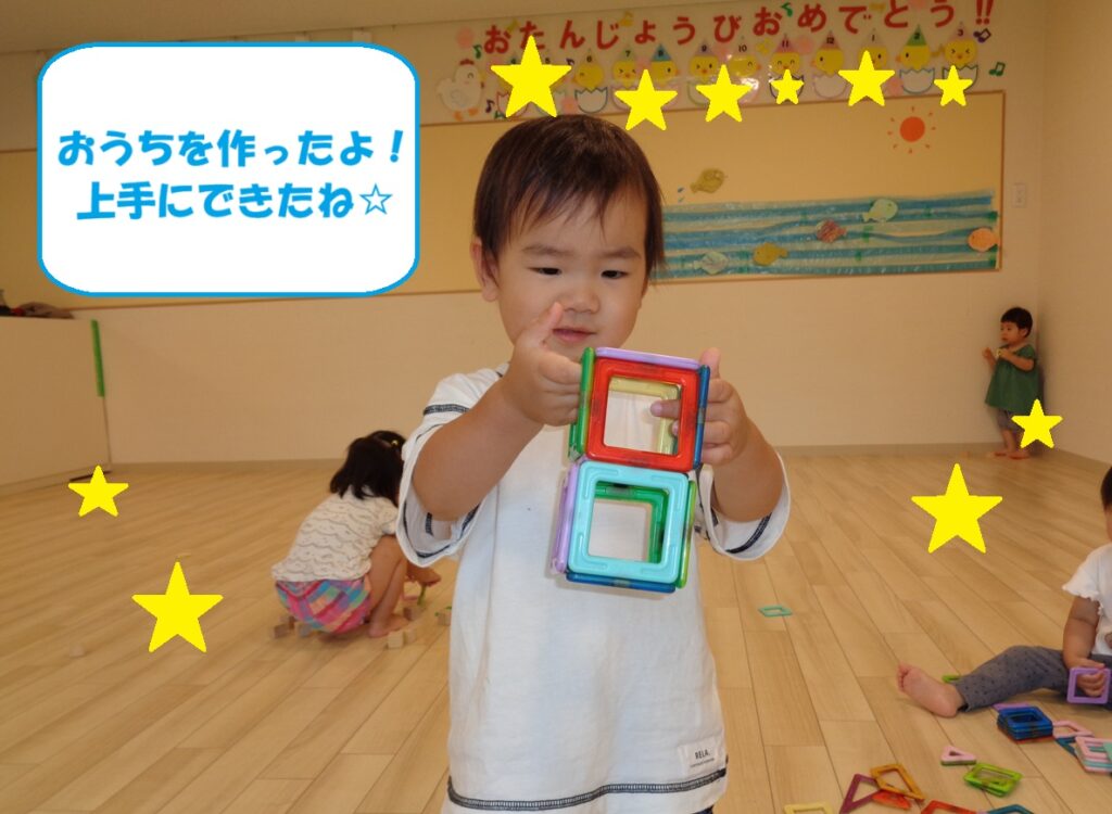 自由遊びの時間にも三角や四角などのいろんな形の磁石のおもちゃで想像力を働かせて遊ぶ姿があります。