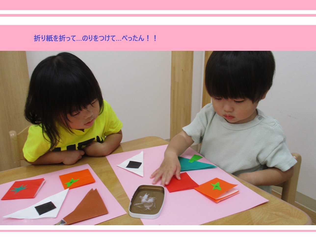 「はんぶんこ」「ぎゅっ!」…集中してカラフルな折り紙をどんどん折ります。